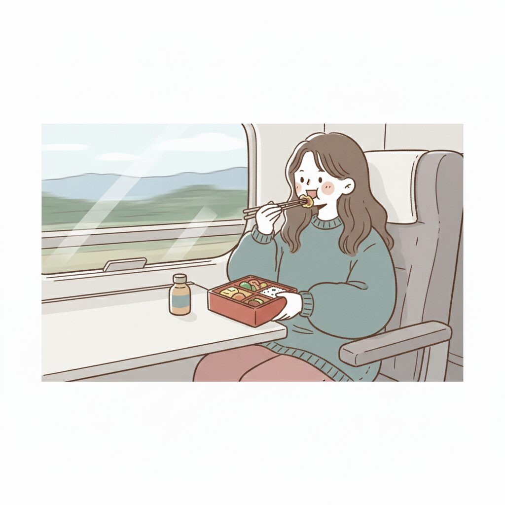 - 昼:新幹線内で食事。グリーン車で手洗い場確保→食べたら即歯みがき。